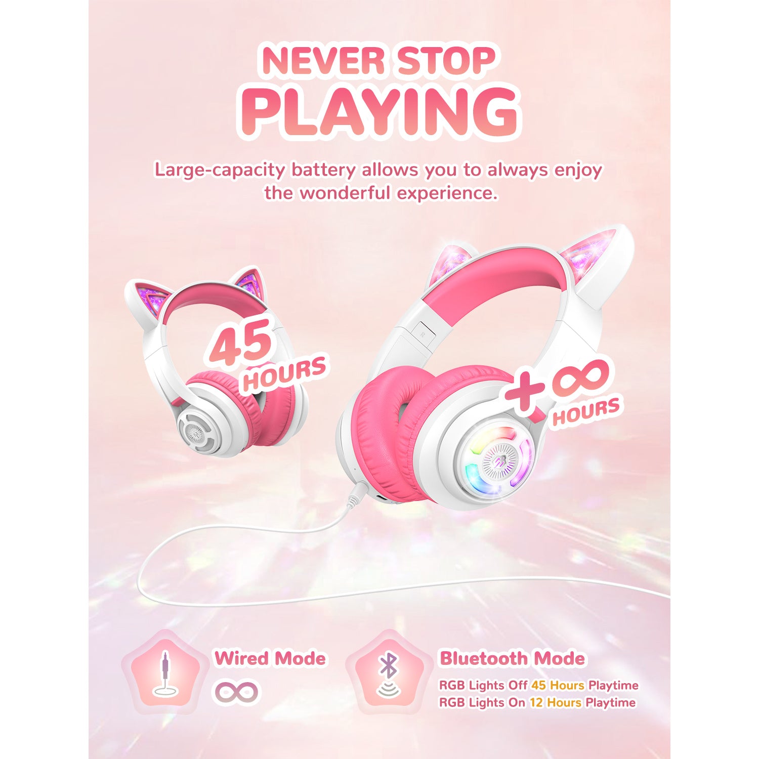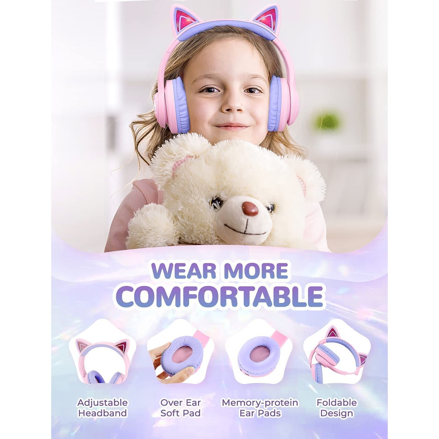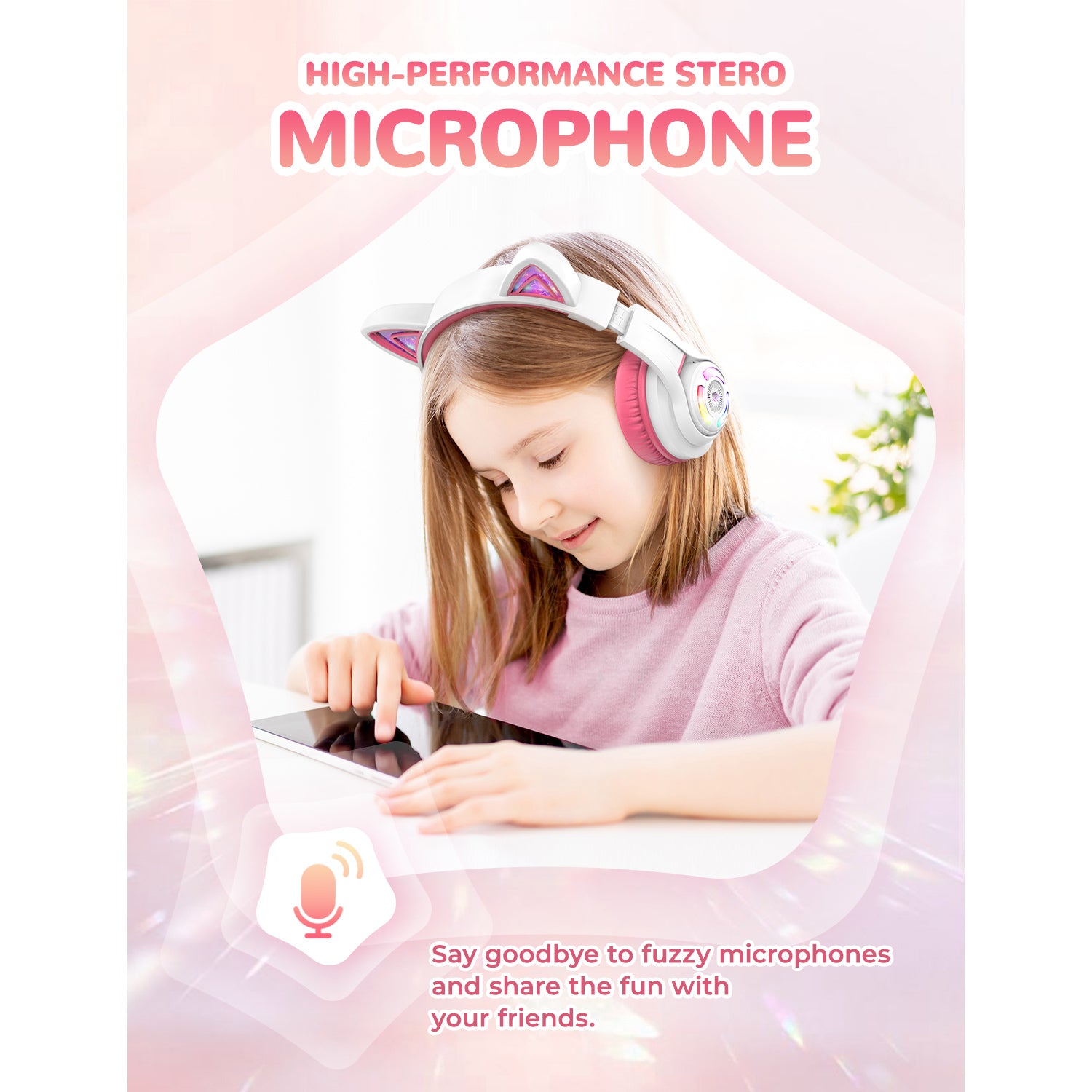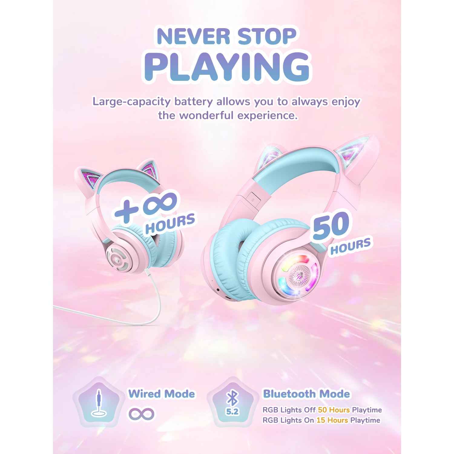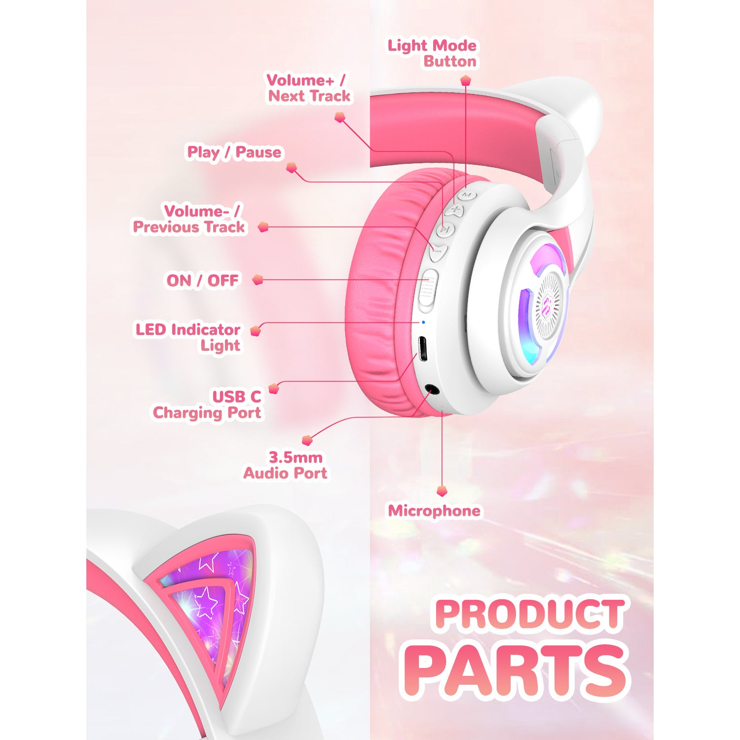 It's the evolution of kids headphones--great sound quality and a cute, fun, kid-friendly design. Your little ones will love the iClever cat ear headphones, whose RGB LED lights are controlled by one independent button. When pressed in Bluetooth mode, it will turn off the lights to extend use time.