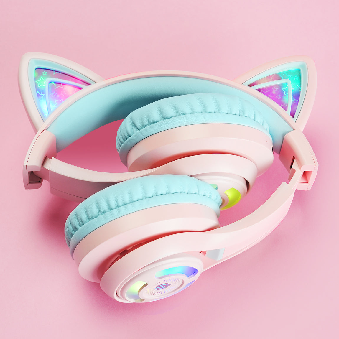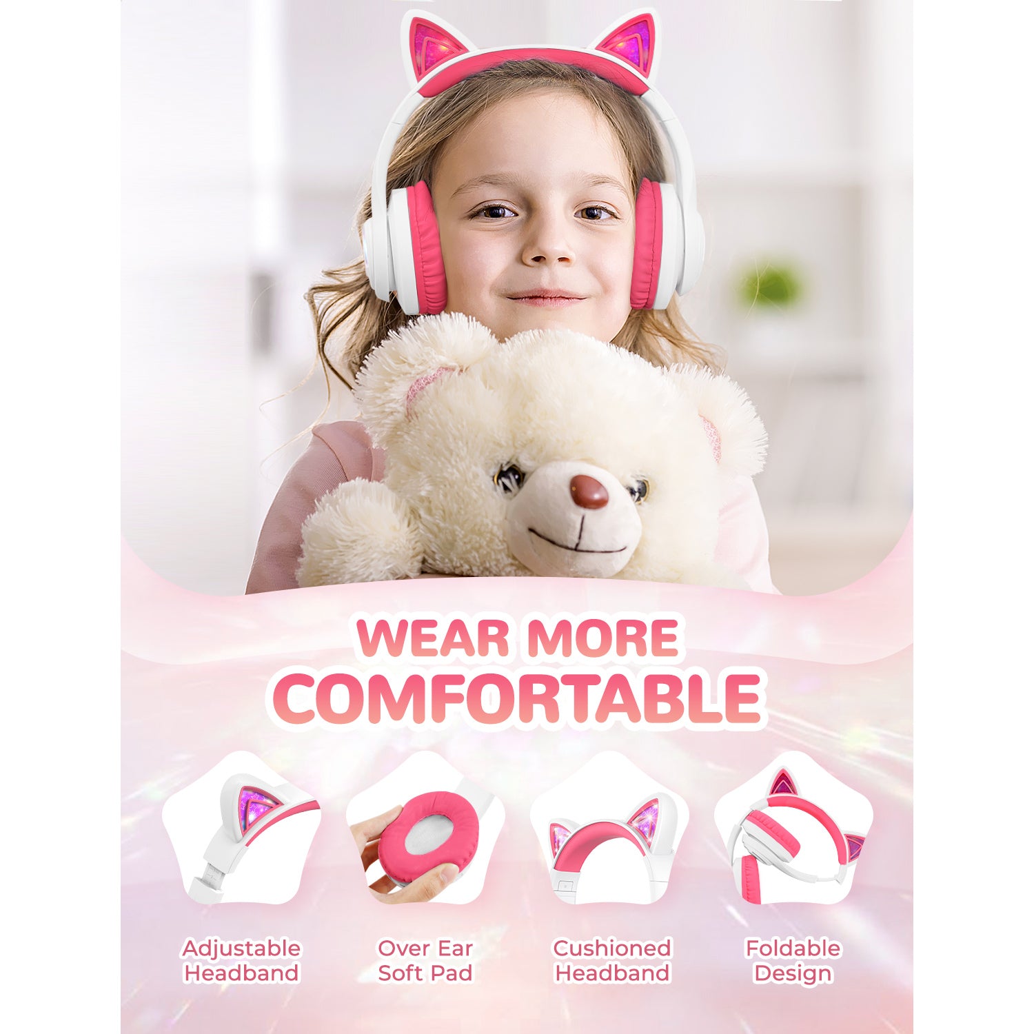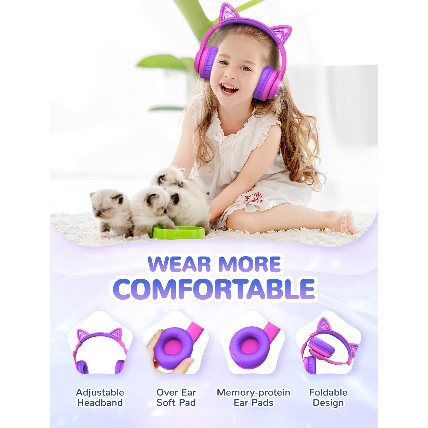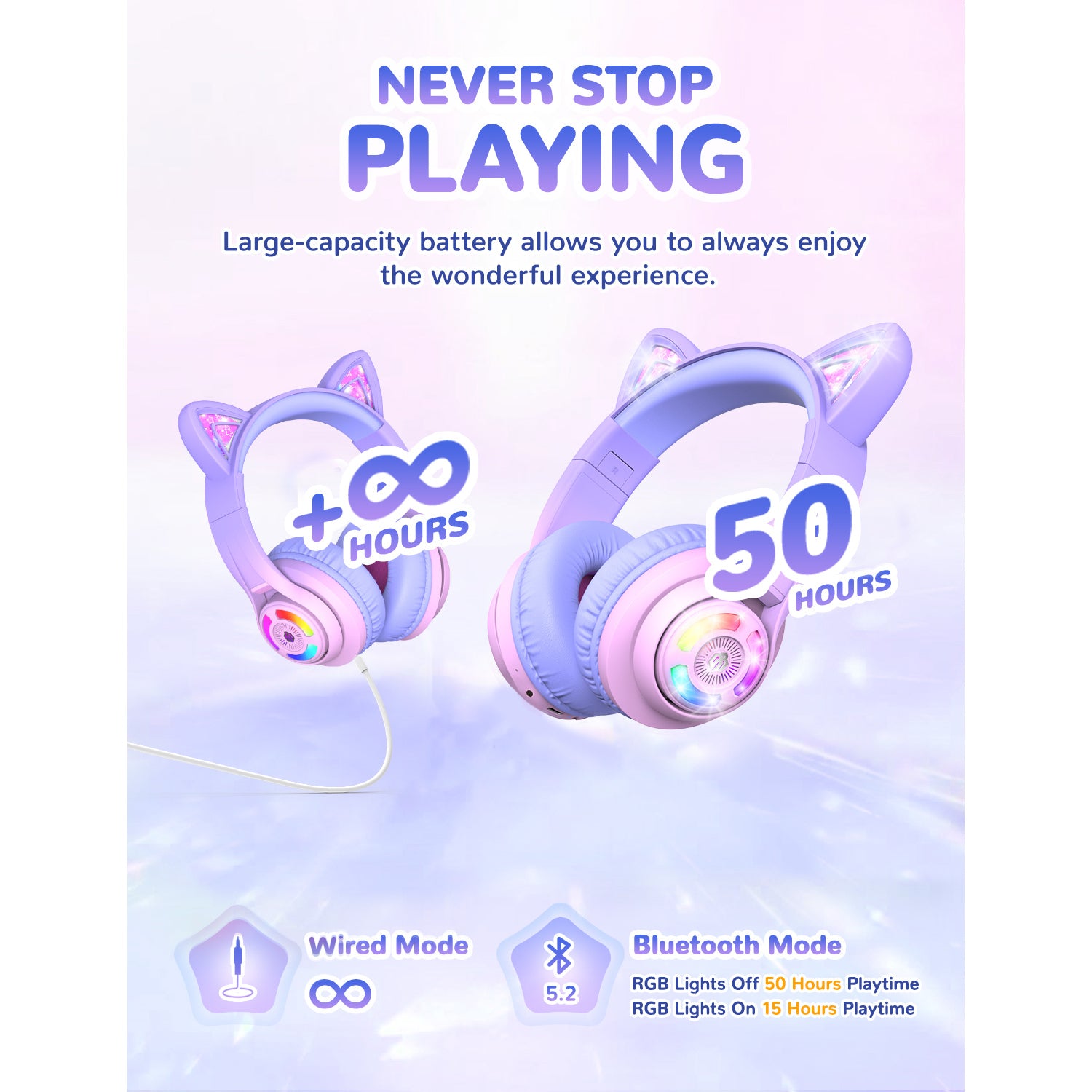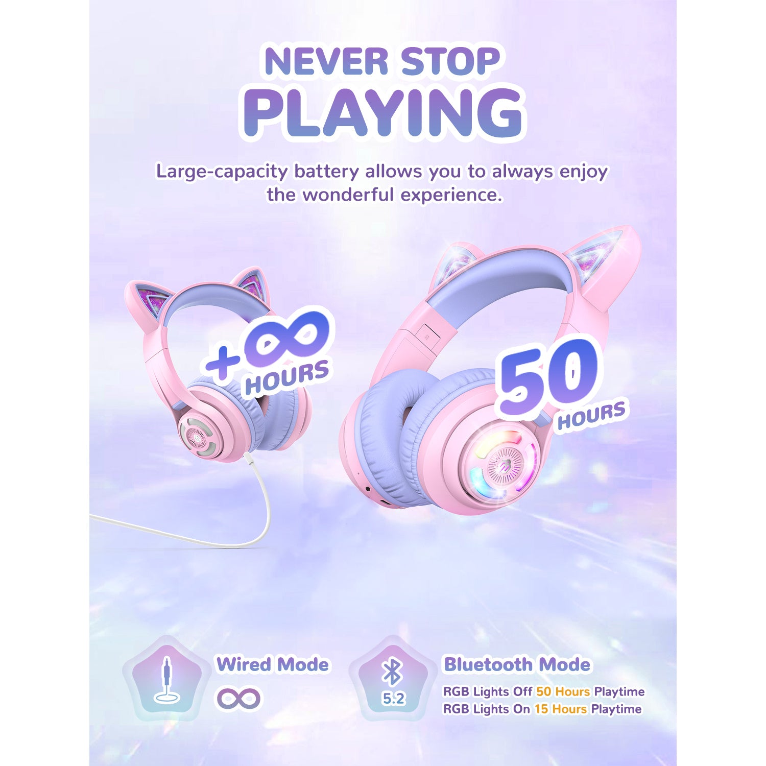 It's the evolution of kids headphones--great sound quality and a cute, fun, kid-friendly design. Your little ones will love the iClever cat ear headphones, whose RGB LED lights are controlled by one independent button. When pressed in Bluetooth mode, it will turn off the lights to extend use time.